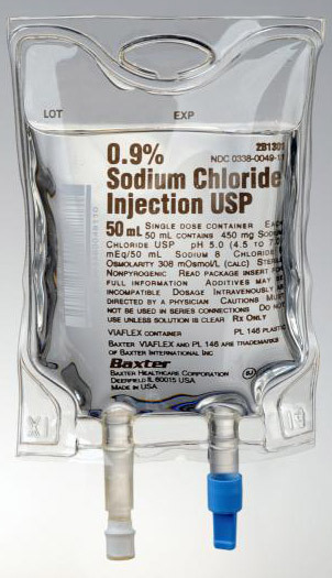 Saline Sodium Chloride is used to replace water chloride and sodium that can be depleted as a result of a variety of diseases. The Baxter Viaflex IV Solutions are available in a variety of configurations and sizes including 50mL 100mL 250mL 500mL and 1000mL Viaflex containers. This solution is isotonic with bodily fluids so it can be used as a diluent or solvent.